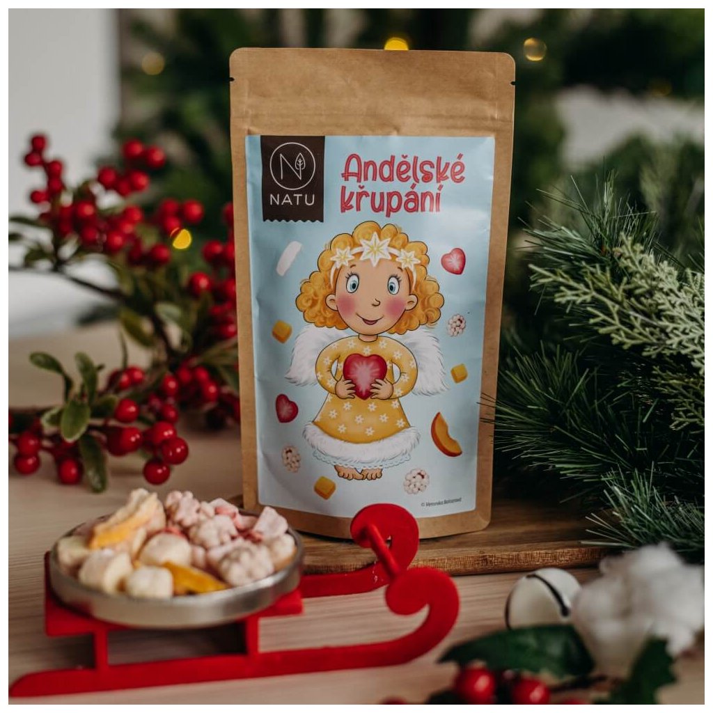 Připravte malým andílkům nadílku plnou ovocných dobrot a hravých chutí! V Andělském křupání najdou křupavé jahůdky a broskve plné letní chuti, které si díky šetrnému sušení mrazem uchovávají přirozenou sladkost, svěžest a vitamíny. Kouzelný zážitek zajistí sametově jemné broskvovo-kokosové smoothie čtverečky. O andělský nádech se postarají sněhobílé maliny obalené v 30% bílé čokoládě a mrazem sušené plátky kokosu lehké jako pírko.