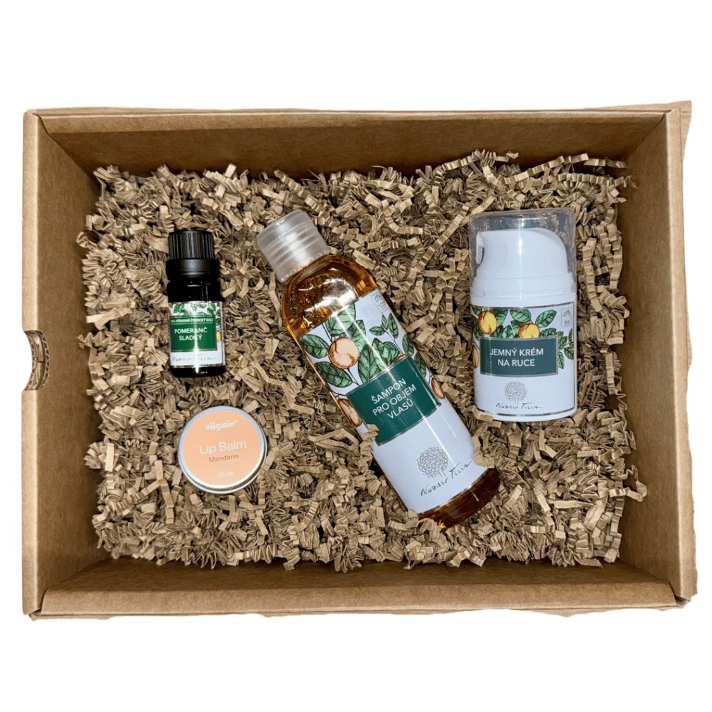 Objevte dokonalou harmonii svěží vůně a péče o tělo s naší přírodní citrusovou sadou. Tento set, který obsahuje éterický olej z sladkého pomeranče, objemový šampon, jemný krém na ruce a mandarinkový balzám na rty, vás potěší nejen svou kvalitou, ale také přírodními složkami, které jsou šetrné k vaší pokožce i vlasům.
