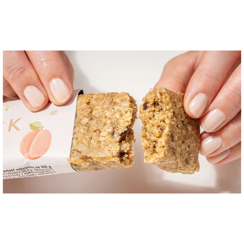 Vanille mit Aprikose ist ein bewährtes Duo – eine zarte und natürlich süße Geschmackskombination. Wir haben sie mit einer Mischung aus Haferflocken und Mandelpaste ergänzt, die dem Riegel Energie und Ehrlichkeit verleiht. Flapjack ist wunderbar geschmeidig und macht dank seiner sorgfältig ausgewogenen Zusammensetzung länger satt, ohne sich schwer anzufühlen.