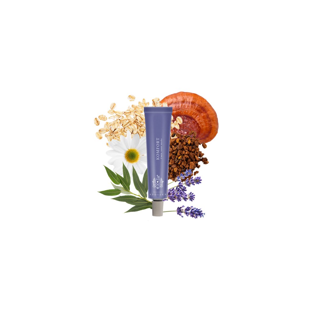 Aqua, Isoamyl Laurate (natürlicher Weichmacher), Helianthus Annuus Seed Oil (Bio-Sonnenblumenöl), Glycerin (pflanzlicher Feuchtigkeitsspender), Glyceryl Stearate Citrate (natürlicher Emulgator), Propanediol (pflanzlicher Weichmacher), Butyrospermum Parkii Butter (Bio-Sheabutter), Cetearyl Alcohol (natürlicher Emulgator), Avena Sativa Kernel Oil (Haferöl), Sodium Levulinate (natürliches antimikrobielles Mittel), Ganoderma Lucidum Extract, Inonotus Obliquus Extract, Cordyceps Sinensis Extract (Reishi-, Chaga- und Cordyceps-Pilze), Caprylyl Glycol, Sodium Anisate (natürlich antimikrobiell), Bisabolol (beruhigender Wirkstoff aus der Kamille), Xanthan Gum (natürliches Verdickungsmittel), Lavandula Angustifolia Oil (ätherisches Lavendelöl), Lactobacillus/Salix Purpurea Bark Ferment Extract (Wirkstoff Salixin®), Tocopherol (Vitamin E), Linalool (Bestandteil ätherischer Öle), Phytic Acid, Lactobacillus Ferment, Lactic Acid (Milchsäure).
