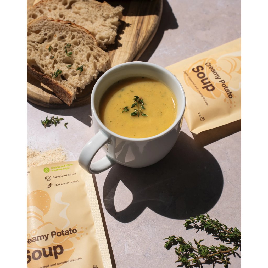 Wir haben für Sie eine cremige Suppe aus hochwertigen BIO-Kartoffeln und anderen erstklassigen Zutaten zubereitet. Einfach mit heißem Wasser übergießen und schon ist der schnelle Snack ohne Konservierungsstoffe und Glutamate im Handumdrehen fertig.