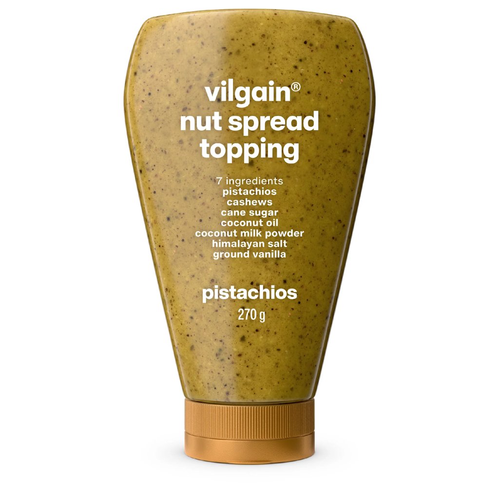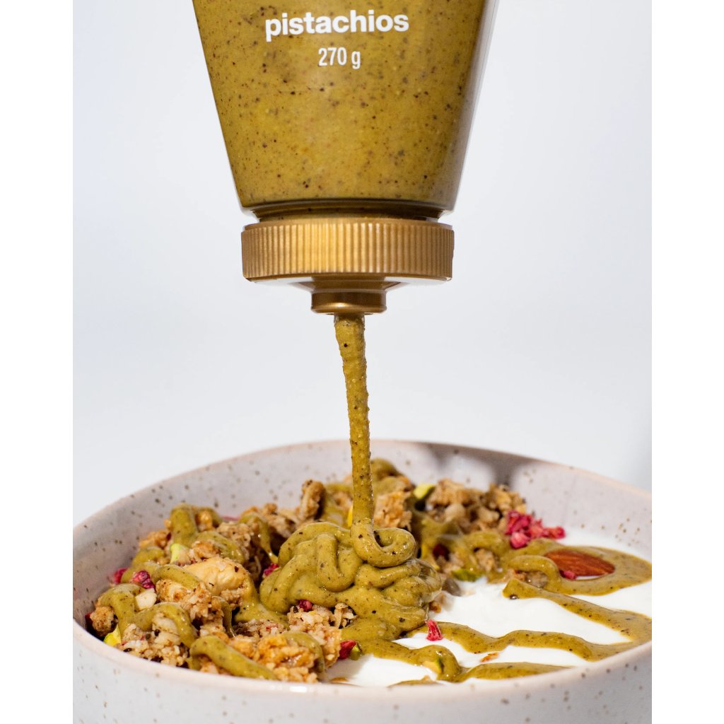 Pistazien 54,35 %, Cashewnüsse 30 %, Rohrzuckerpulver, natives Kokosöl*, getrocknete Kokosmilch*, Himalaya-Salz, gemahlene Vanille.