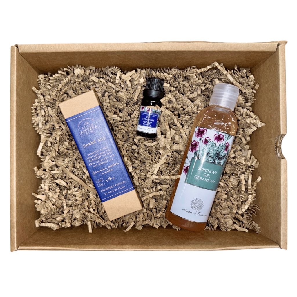 Tato relaxační sada přináší dokonalou přírodní péči pro vaše tělo a mysl. Spojuje jemnou vůni gerania a uklidňující složky, které podporují regeneraci a harmonizaci pleti, stejně jako vaši pohodu. Sprchový gel, pleťová maska a éterický olej s esencí geranium bourbon přináší jemnou péči a uvolnění do vašeho večerního rituálu.