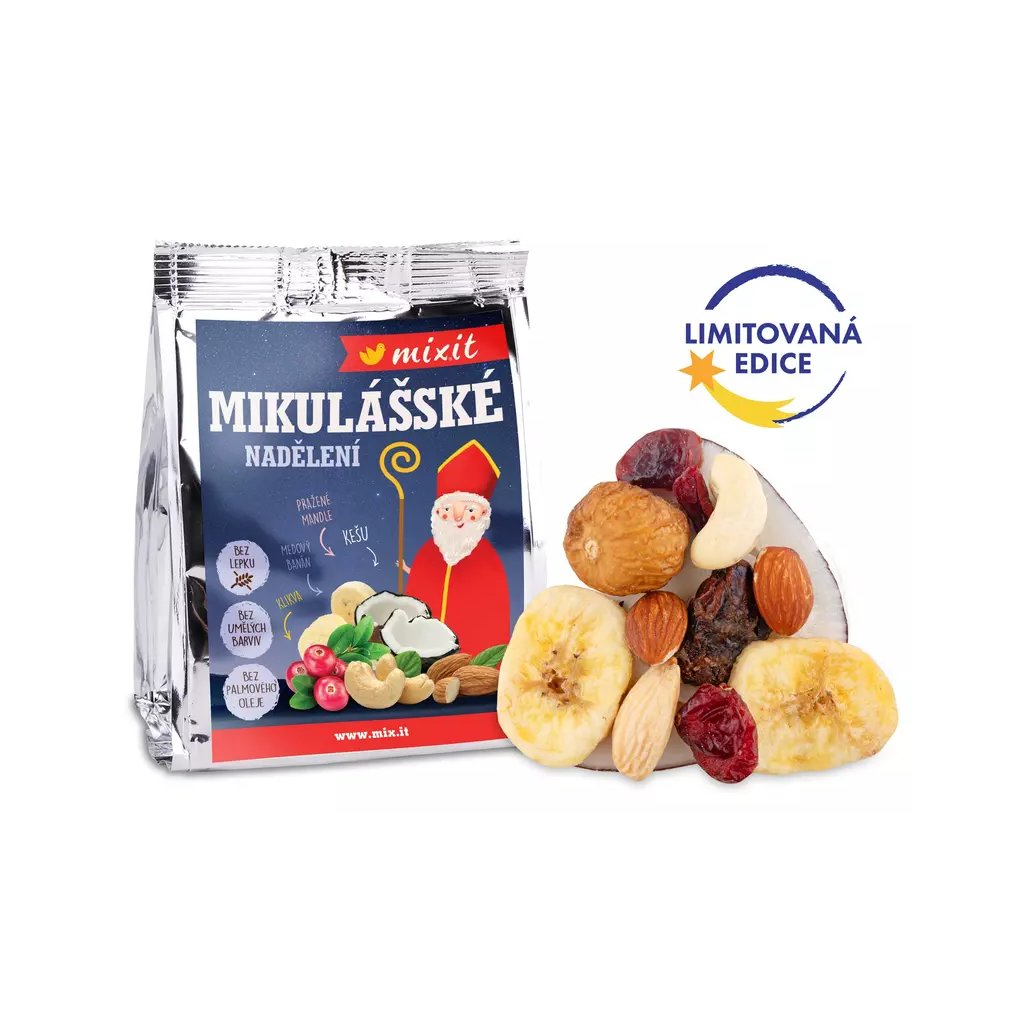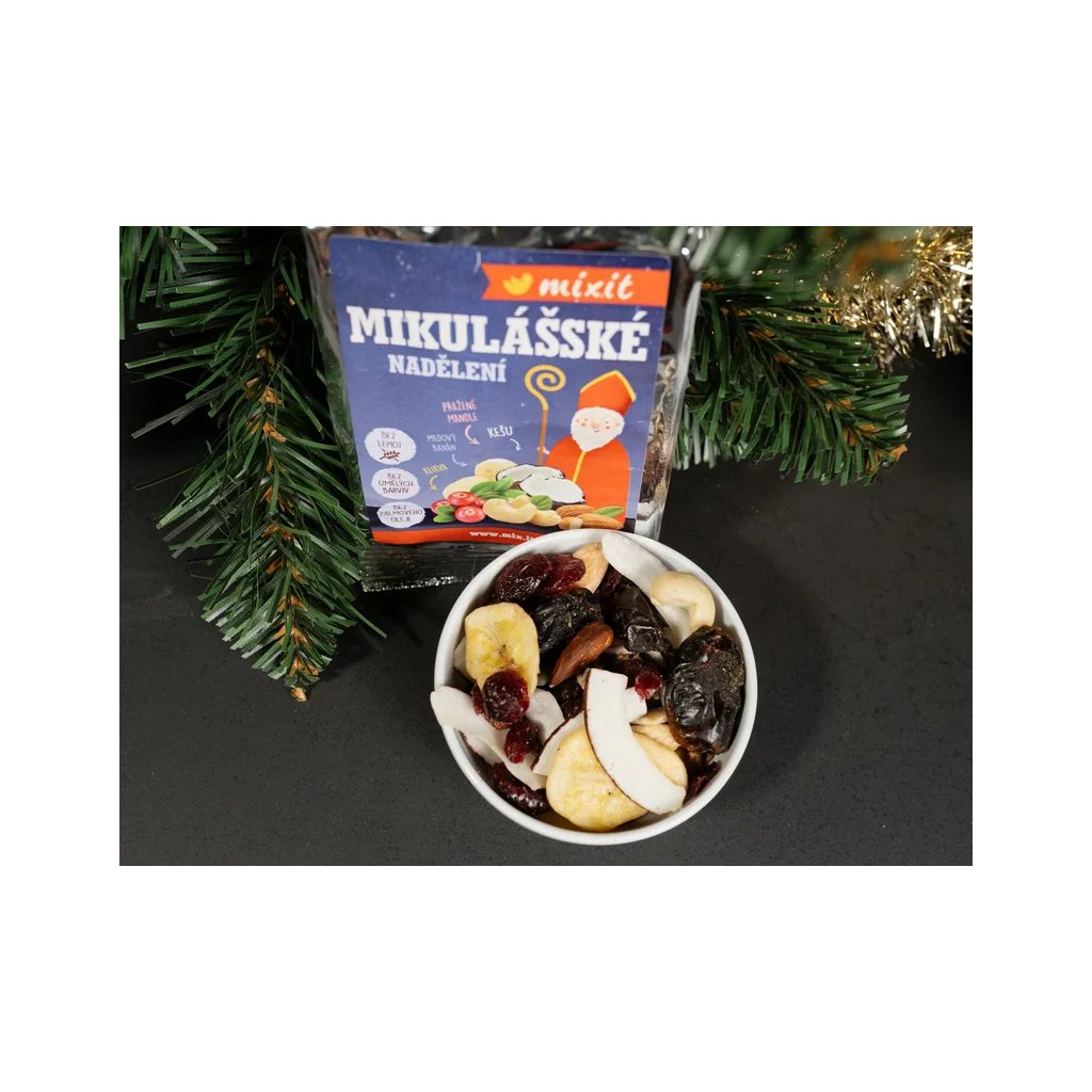 Mik, miku, Mikulášské nadělení do kapsy! Pro všechny hodné děti jsme namixovali ořechy, kokos, brusinky, mini fíky, medový banán a další zdravé zobání. Tahle nadílka se vejde do kapsy a je bez lepku, umělých barviv a palmového oleje. Mikuláš bude mít co dělat, aby vyladěnou směs ořechů a ovoce nesnědl dětem cestou. :-)