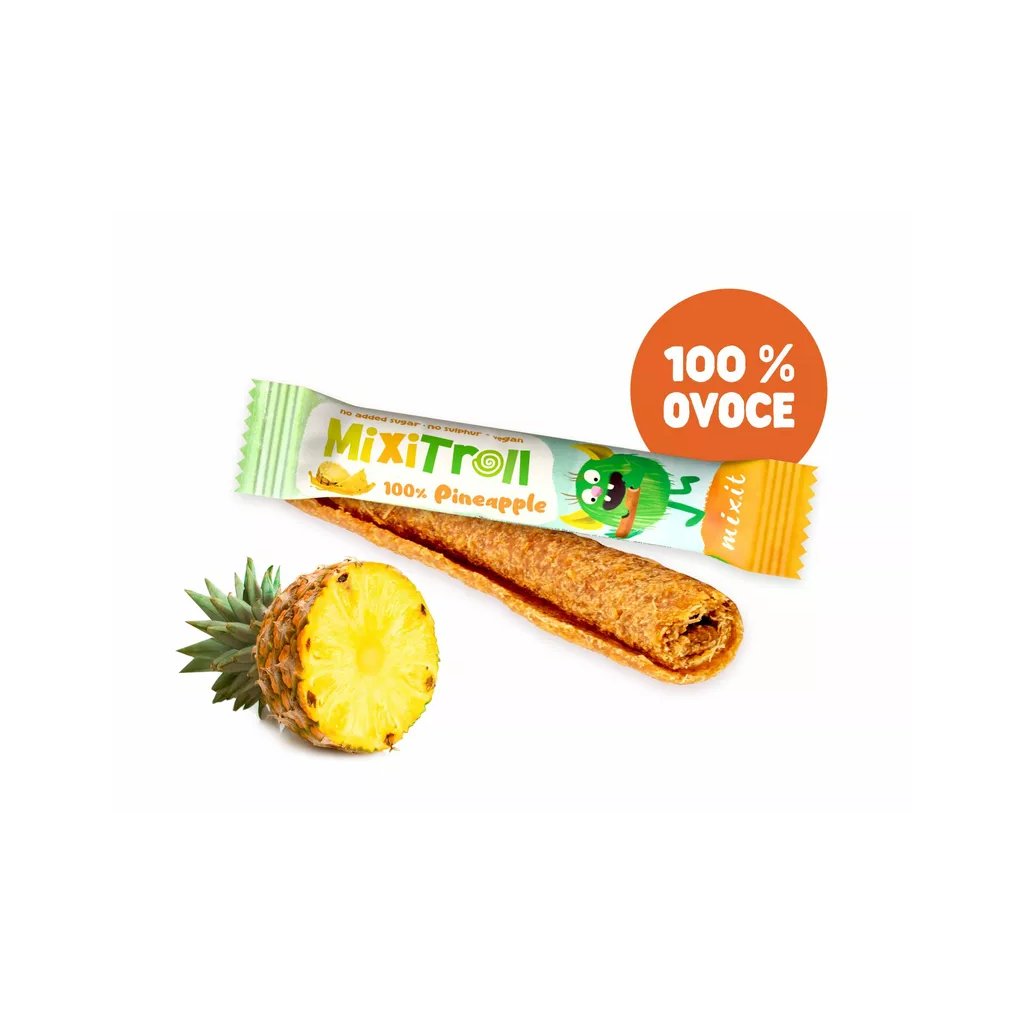 Nechceme Vás vytrolit, tahle dobrota ze 100% ovoce je sladká pravda! Kdo říkal, že ovoce nemůže být zábava? Ochutnejte oblíbený ananas v nové podobě! MixiTroll - Ananas je lahodný a zdravá rolka vyrobená ze 100 % z čerstvého ananasu bez přidaného cukru, barviv a konzervantů. Sladká chuť exotiky, která se vejde do kapsy – ideální jako zdravá svačina na cesty, do práce nebo pro děti do školy. Každá MixiTroll byla vyrobena metodou šetrného sušení při nízké teplotě, takže si zachovala všechny zdraví prospěšné vitamíny a minerály.