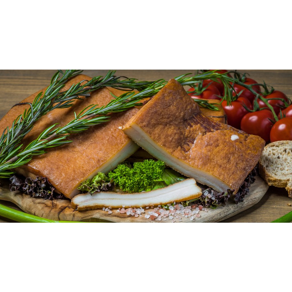 Wędzony produkt mięsny poddany obróbce cieplnej. Składniki: Boczek wieprzowy 98%, substancja konserwująca E250.
