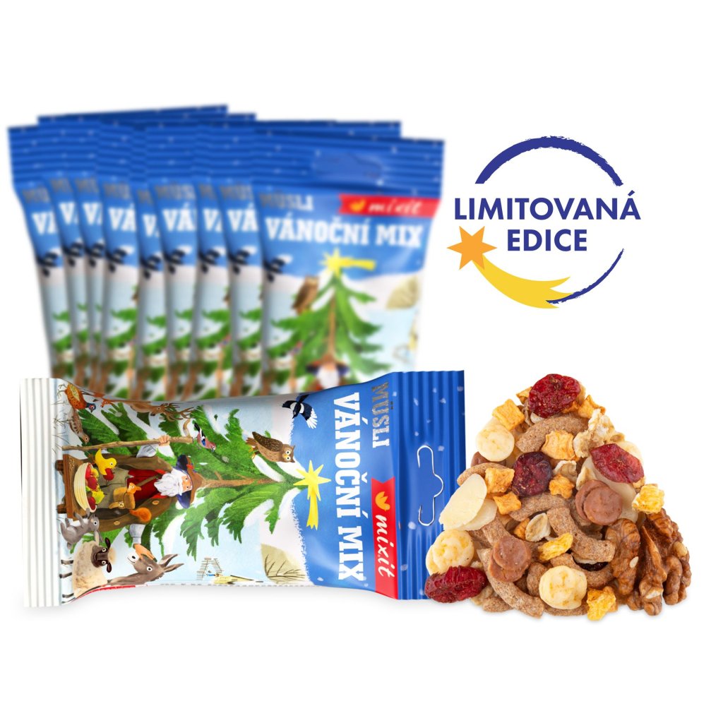 Vánoční MIX je „hřešení“, za které Vám ježíšek černý puntík neudělá. :-) Dopřejte si voňavou směs sušeného ovoce, čokolády a oříšků doladěnou skořicí, hřebíčkem a badyánem v praktickém balení kdekoliv. Přidali jsme kukuřičné lupínky v mléčné a bílé čokoládě pro dobrou náladu a ovesné lupínky s vlákninou pro spokojené bříško. Je to náš historicky nejprodávanější mix, tak na něm asi něco bude. :-)